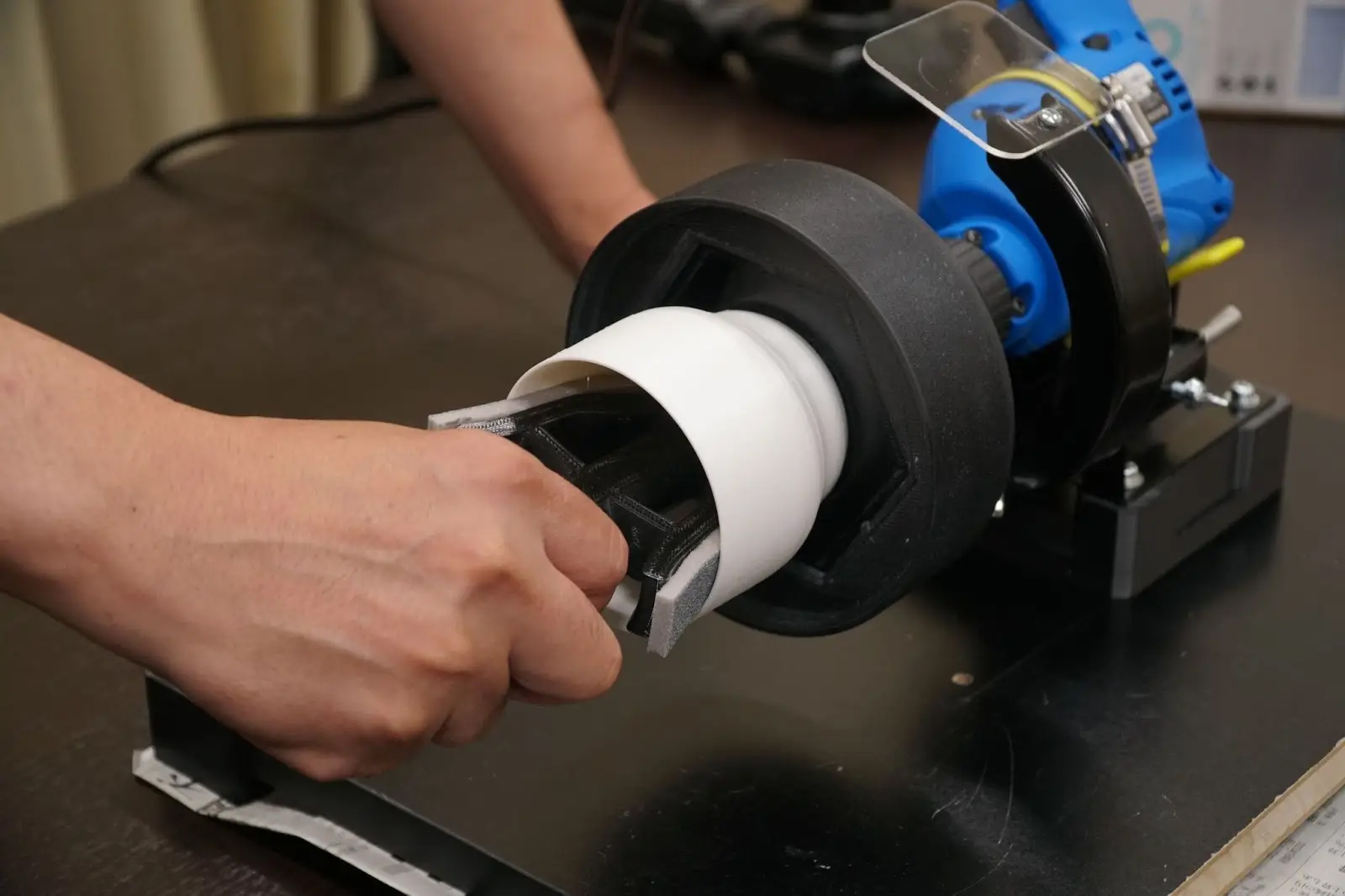 さらに、同社は製造工程で使う「治具」も自ら設計し、Raise3Dで内製しています。漆のノリを良くするための研磨作業を自動化する装置では、強度が必要なアーム部分にはPET-CFを、製品を傷つけずに優しく保持するチャック部分にはTPUをと、材料の特性を的確に使い分けています。